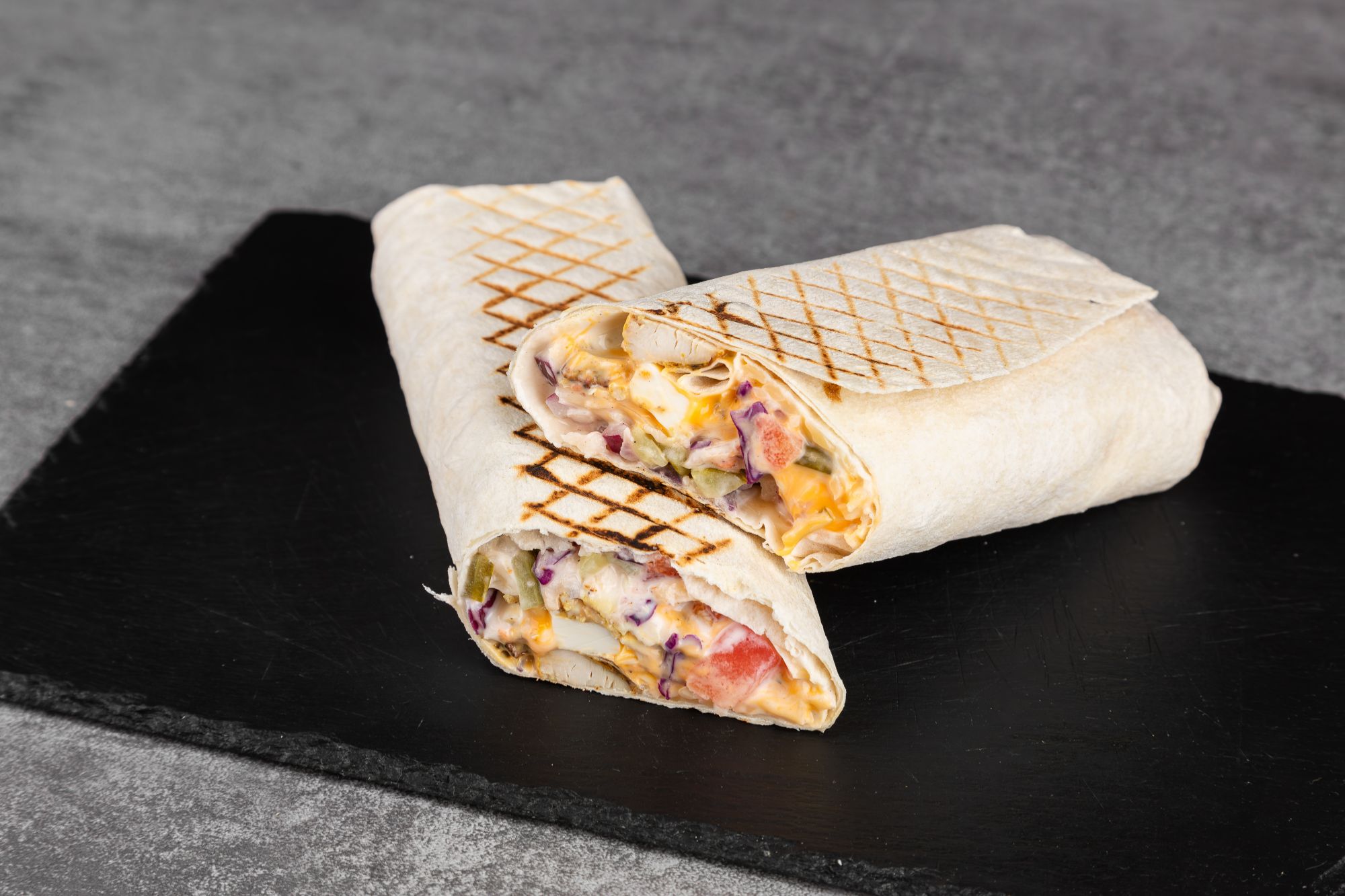 tortilla, mięso, ser, surówka, sosy